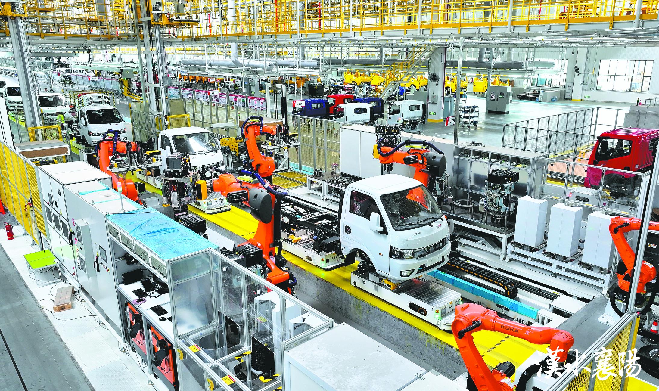 在東風(fēng)汽車股份有限公司輕型商用車智能制造和綠色工廠升級項(xiàng)目總裝車間里,120臺重載AGV(搬運(yùn)機(jī)器人)穿梭在3萬平方米的車間內(nèi),“帶領(lǐng)”車輛有序完成總裝作業(yè)