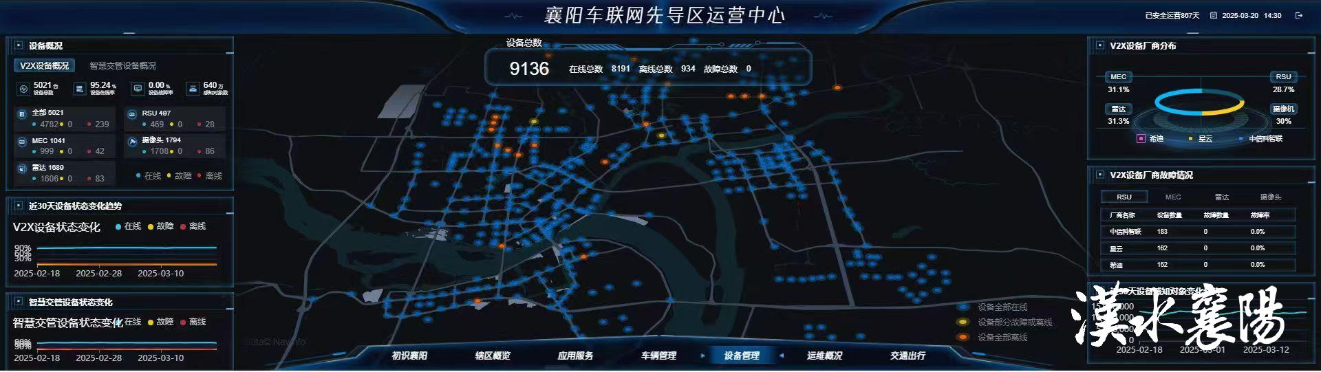 4月3日,在襄陽市車聯(lián)網(wǎng)運(yùn)營的大屏上,448個(gè)智慧路口星羅棋布,740公里智能道路血脈暢通,一張輻射面積562平方公里的大規(guī)模城市級車聯(lián)網(wǎng),正助力襄陽街頭上演“科幻場景”。