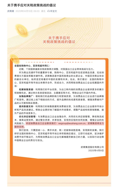 武商集團率先發(fā)布公告稱,將依托百貨、超市、購物中心全業(yè)態(tài)矩陣,為外貿(mào)企業(yè)開辟“綠色通道”,通過數(shù)據(jù)共享實現(xiàn)精準選品?!爸饕峭ㄟ^拓展銷售渠道、加強品牌的推廣,優(yōu)化供應鏈管理,為出口企業(yè)提供更多經(jīng)營上的便利,特別是服裝品類、日用品品類、快消品、大健康等等,這些品類的省內(nèi)企業(yè),可以快速展開相關(guān)的產(chǎn)業(yè)協(xié)同和合作?!蔽渖碳瘓F創(chuàng)新事業(yè)部部長付有告訴記者。