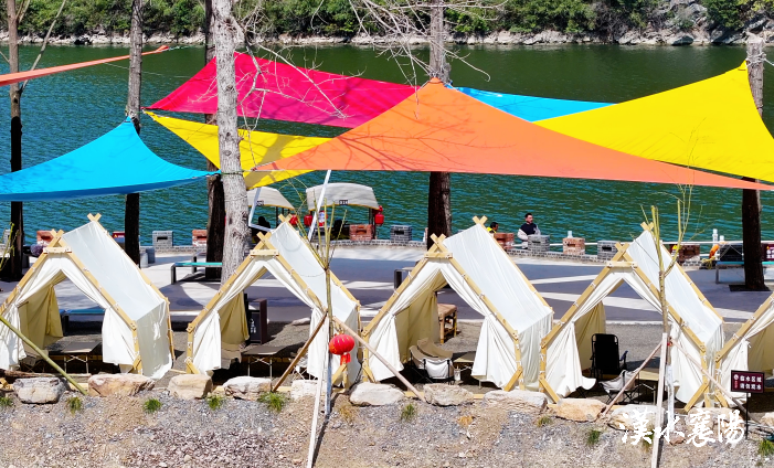 坐在落地玻璃窗前,一邊品著咖啡,一邊欣賞著“兩岸青山相對(duì)出”的美景。窗外,白色的帳篷與樹間的吊床相映成趣;孩子們?cè)谇锴湘覒颍淮a頭旁的河灘上矗立著南河版的“孤獨(dú)的一棵樹”。