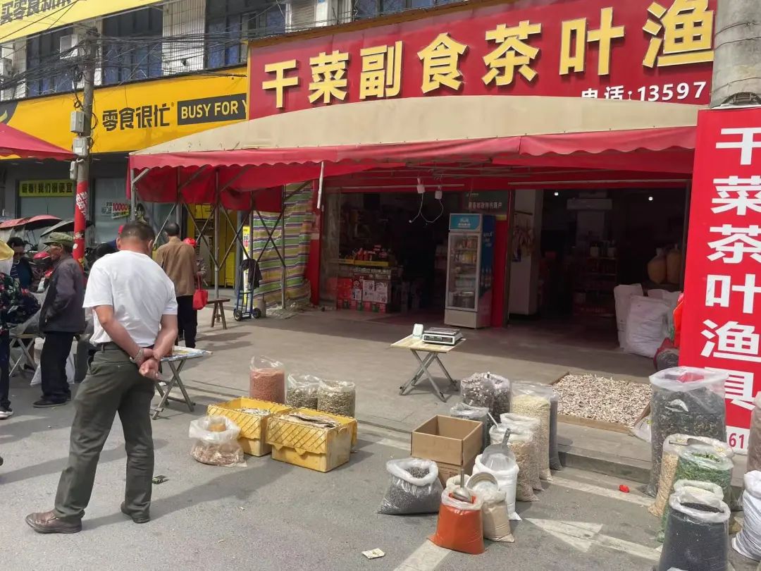 4月16日,正是檀林趕集日。一大早,檀林街上劉國安的干菜店鋪早已門庭若市,干竹筍、干蘿卜、干豆角,干辣椒等等,各種干菜是擺了一地,連下腳的地方都沒有。