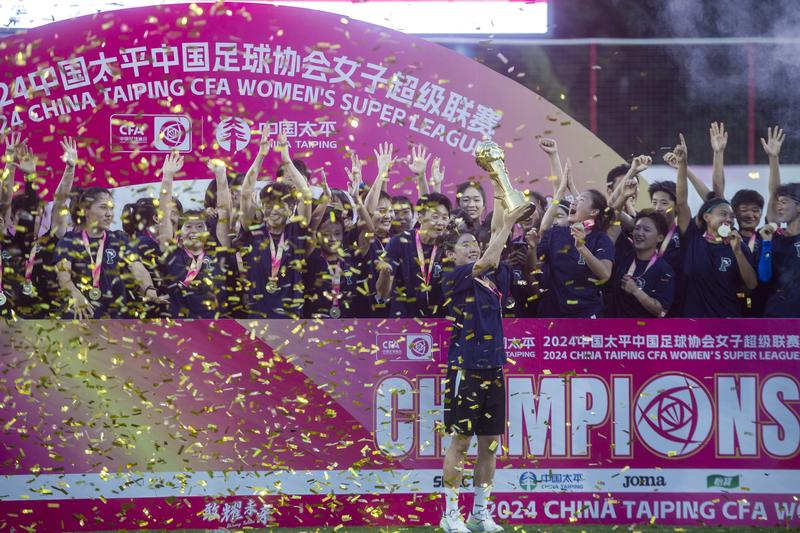 2024中國足協(xié)女超聯賽,武漢車谷江大隊連續(xù)第五次獲得女超冠軍。圖為球員姚偉(前)在頒獎儀式上舉起獎杯。新華社記者 伍志尊 攝
