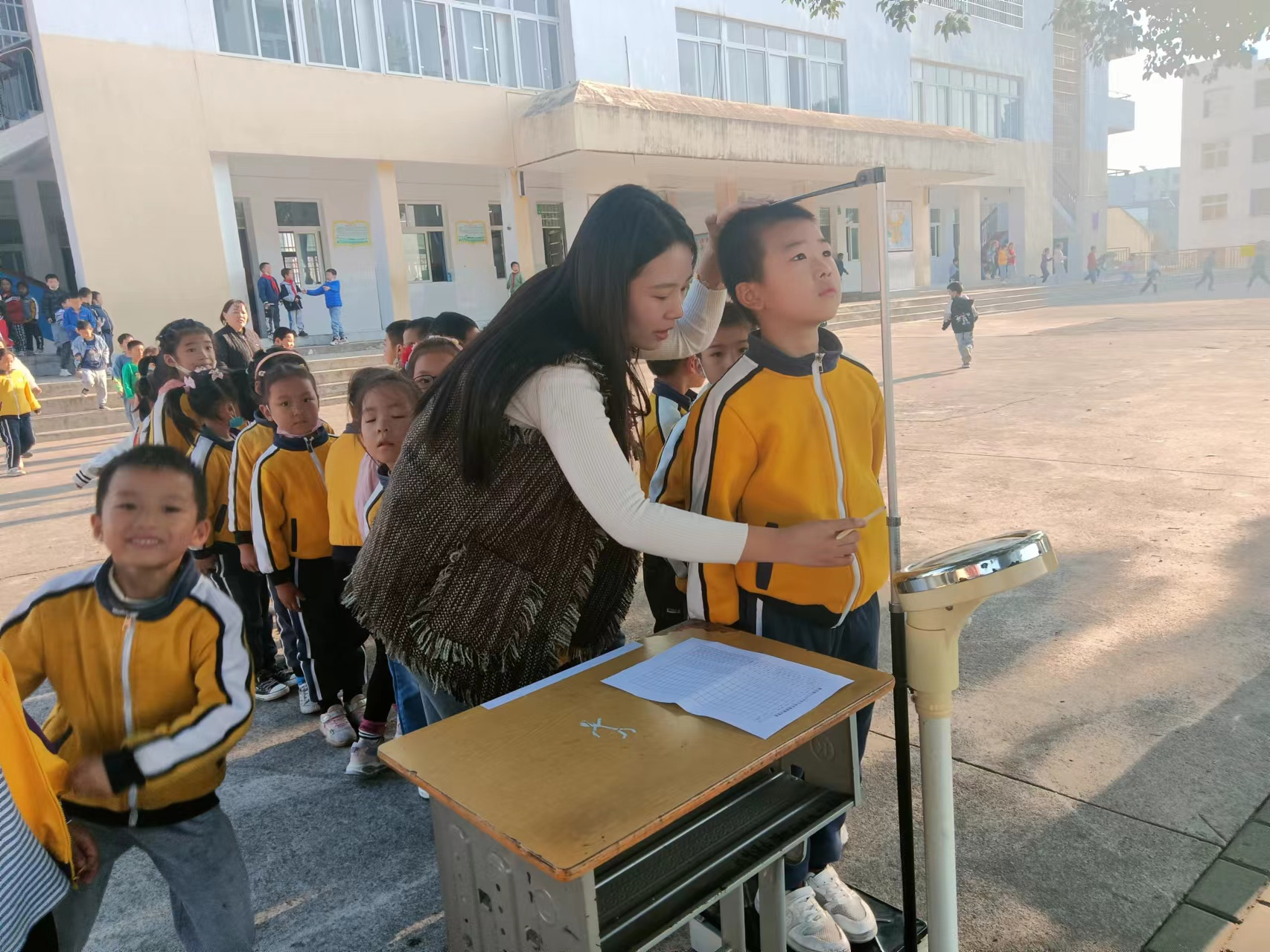 11月3日,曹武鎮(zhèn)中心小學(xué)啟動(dòng)學(xué)生體質(zhì)健康測(cè)試工作,檢測(cè)學(xué)生身高、體重、肺活量、50米×8往返跑、一分鐘跳繩等項(xiàng)目,全方面記錄學(xué)生體質(zhì)健康情況,貫徹落實(shí)《學(xué)生體質(zhì)健康標(biāo)準(zhǔn)》。 (教師為學(xué)生測(cè)量身高)教
