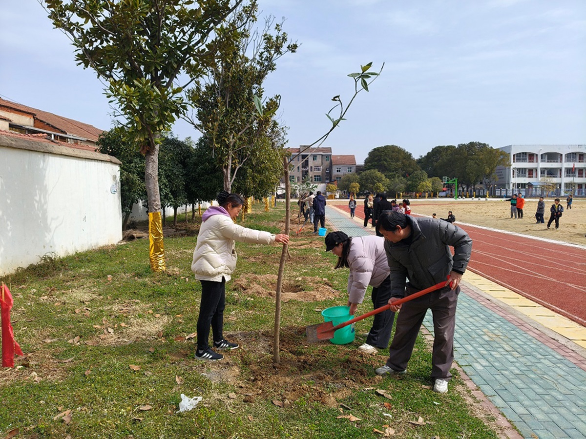 3月15日,永興中學(xué)組織部分教師、學(xué)生,開展“綠滿京山”義務(wù)植樹活動。植樹現(xiàn)場一片熱火朝天的景象,大家三五個人一組,挖坑、扶樹、鏟土、填土、壓實(shí),步驟有條不紊地進(jìn)行。經(jīng)過大家齊心協(xié)力的勞動,一棵棵新栽