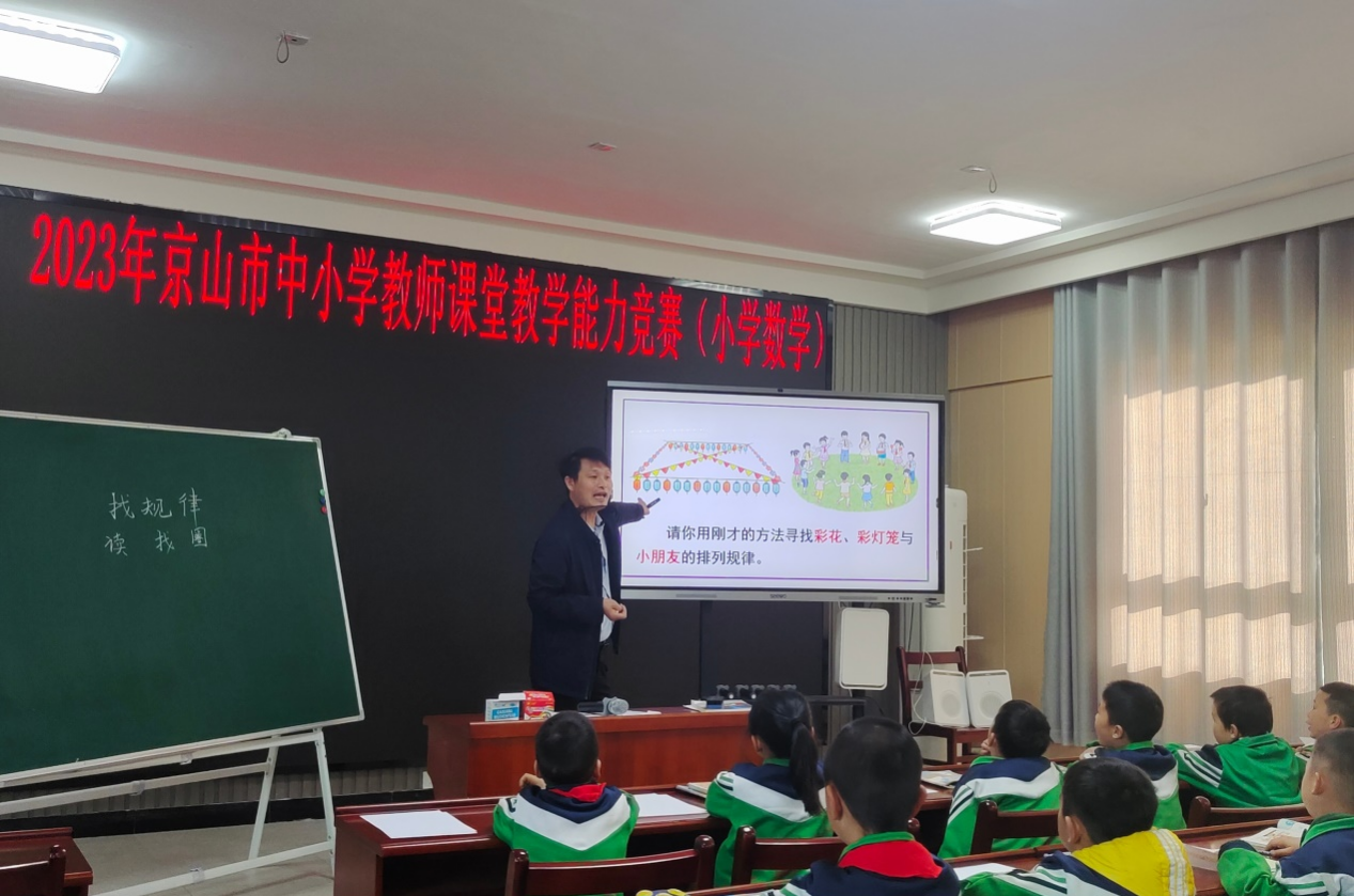 ——市小學(xué)數(shù)學(xué)教師課堂能力競(jìng)賽在新市一小舉行 (許波老師執(zhí)教一年級(jí)《找規(guī)律》)3月14日,京山市小學(xué)數(shù)學(xué)教師課堂能力競(jìng)賽在新市一小舉行。此次競(jìng)賽活動(dòng)由市教研室組織開(kāi)展,為期三天,來(lái)自全市20所小學(xué)的數(shù)