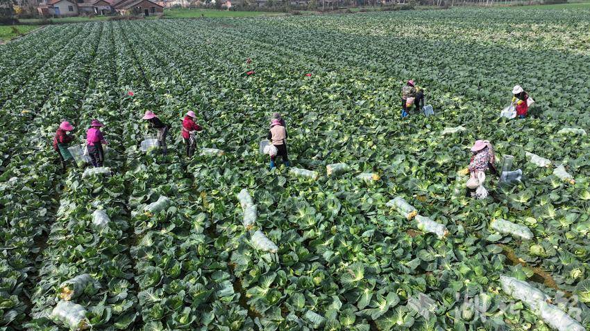 蔬菜地里,農(nóng)戶們彎腰采摘,打包搬運(yùn),繼而裝車,一氣呵成;田埂上,“鄂R”牌照的物流車載著甘藍(lán)、菜薹、雪里蕻等蔬菜,蓄勢待發(fā)。