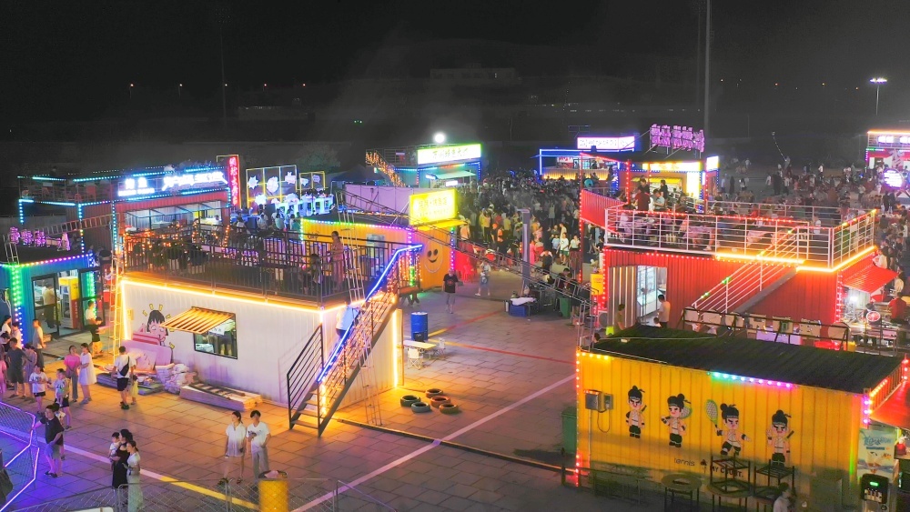 今年6月,獨具特色的集裝箱集市驚艷亮相,順利開街。夜幕降臨后,在霓虹燈照射下,17個集裝箱顏色鮮艷,錯落擺放,設(shè)計感十足,該集市由美食區(qū)、休閑街區(qū)、公益地攤區(qū)、游樂區(qū)等4個區(qū)域和網(wǎng)球大舞臺組成,共有15家餐飲店、9個游樂項目和145個攤位。烤生蠔、芝士玉米、手工檸檬茶等美食飲品應(yīng)有盡有,旋轉(zhuǎn)木馬、碰碰車等項目吸引兒童爭相體驗,網(wǎng)球大舞臺為市民提供才藝展示的平臺。