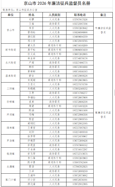 廉潔征兵,請您監(jiān)督!京山市2026年廉潔征兵監(jiān)督員信息公示