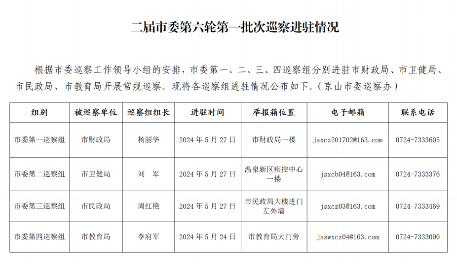 根據(jù)《中國共產(chǎn)黨巡視工作條例》和中央、省委、荊門市委、京山市委關(guān)于巡視巡察工作的要求,按照市委巡察工作領(lǐng)導(dǎo)小組安排,二屆市委第六輪第一批次巡察于2024年5月24日至6月底,對市財政局、市衛(wèi)健局、市民