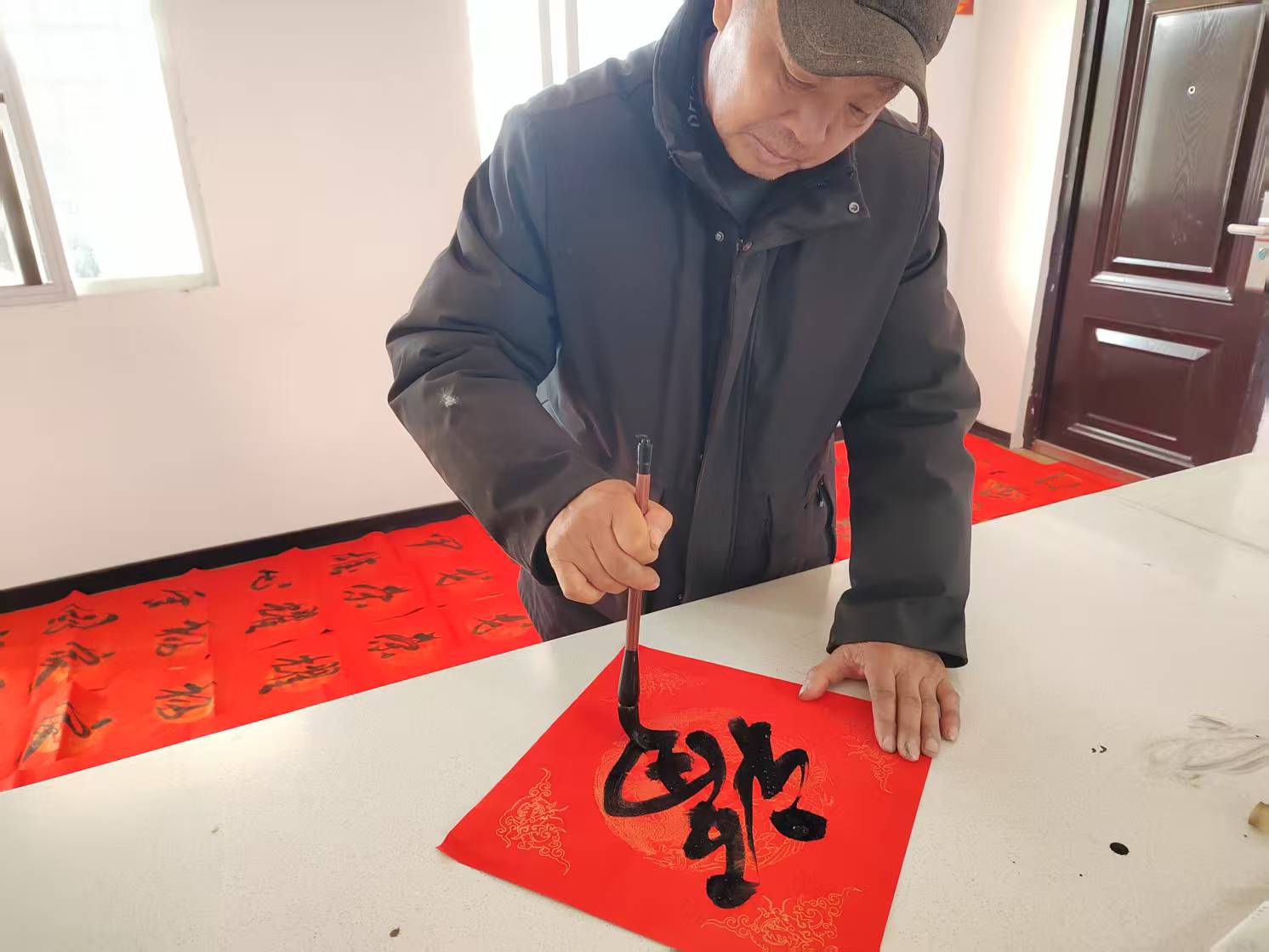 活動(dòng)當(dāng)天,新時(shí)代文明實(shí)踐志愿者和書法愛好者們齊聚敖家村,他們揮毫潑墨,為村民們書寫了一副副寓意吉祥的對(duì)聯(lián)和“?!弊帧?/p>