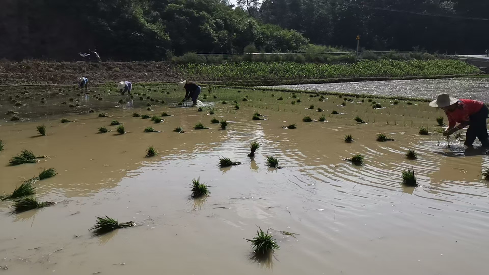 一大早,太陽剛剛升起,山間晨霧未散,稻田里已經(jīng)來了一群人。他們身穿高筒雨鞋,頭戴草帽,將一捆捆秧苗隔一段距離丟到田里。然后左手拿著一把秧苗,右手將秧苗分出,如蜻蜓點水般迅速地把秧苗插進泥土里。隨著太陽升高,稻田里一排排嫩綠的秧苗迎風搖曳,呈現(xiàn)出一幅生機勃勃的美景。