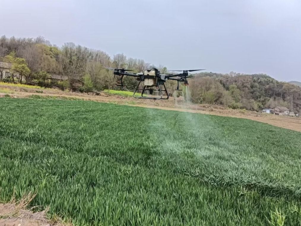 4月28日,在綠林鎮(zhèn)中臺村成片麥地上空,一輛無人機(jī)正在噴灑農(nóng)藥,助力小麥茁壯成長。