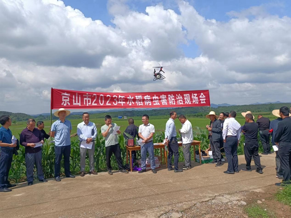 裝藥、按動遙控器、控制飛機勻速飛行、開始噴灑作業(yè)。5月24日上午,在宋河鎮(zhèn)同升村舉行的京山市2023年水稻病蟲害防治現(xiàn)場會現(xiàn)場,植保無人機正在給同升村新插的一片秧田示范噴灑農(nóng)作物。(水稻病蟲害防治