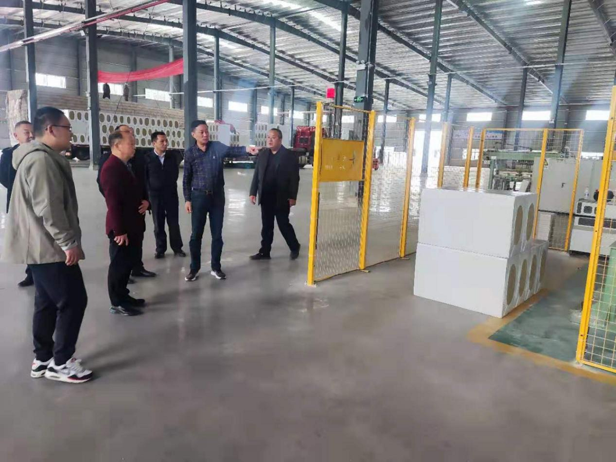 姚明軍(右二)向與會(huì)人員介紹情況“每天都要發(fā)好幾車的貨,現(xiàn)在還有幾臺(tái)車正等著裝貨。”這段日子,面對(duì)產(chǎn)銷兩旺的大好形勢(shì),可歐文斯巖棉產(chǎn)業(yè)園法人代表姚明軍卻一點(diǎn)也笑不起來?!叭ツ?,我們沖著京山市豐富的白云