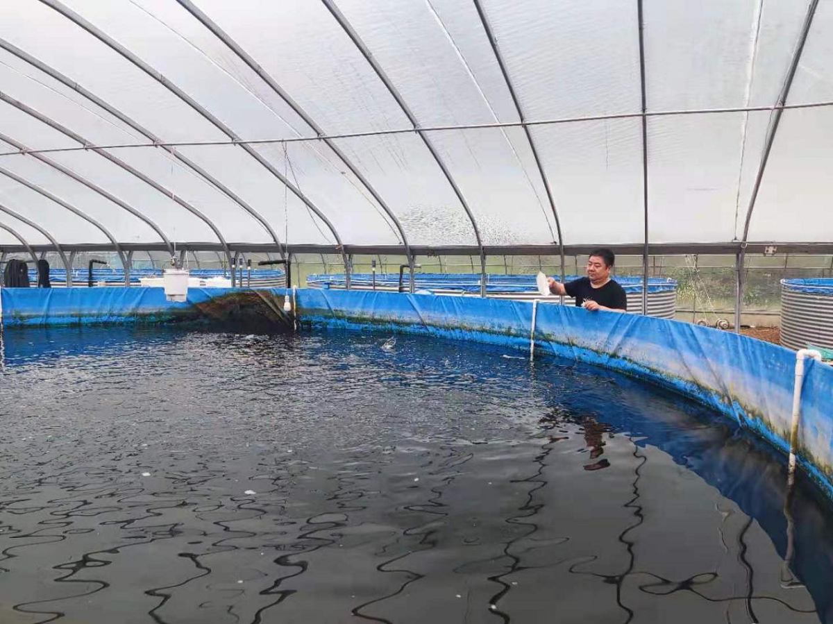 馬星正在給馬口魚喂食群山環(huán)抱,清泉流淌。幾排鋼構(gòu)溫室里,11個(gè)陸基圍桶一溜兒排開。4月12日一大早,在位于宋河鎮(zhèn)芭蕉寺村新羅泉邊的京山皓宇設(shè)施農(nóng)業(yè)養(yǎng)殖試驗(yàn)場(chǎng),項(xiàng)目主要投資人馬星一邊投喂飼料,一邊仔細(xì)觀