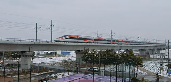 高鐵軌道上,銀白色的列車穿行在銀裝素裹的景致中,車身與雪景交相輝映,仿佛一條鐵龍?jiān)诋?huà)中游走。