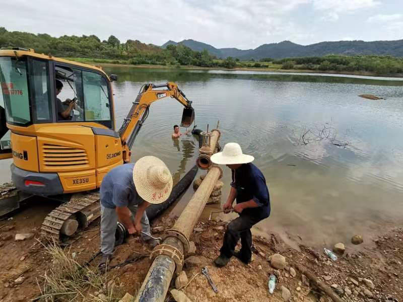 工人正在安裝抽水管道8月25日,石龍鎮(zhèn)統(tǒng)戰(zhàn)辦匯聚統(tǒng)戰(zhàn)力量,組織統(tǒng)戰(zhàn)人士、干部群眾攜手抗旱,要求各村加強排查,上報旱情,摸清缺水戶數(shù)、目前儲水等情況。自7月中旬以來,高溫天氣導致該鎮(zhèn)部分村組出現(xiàn)旱情,部