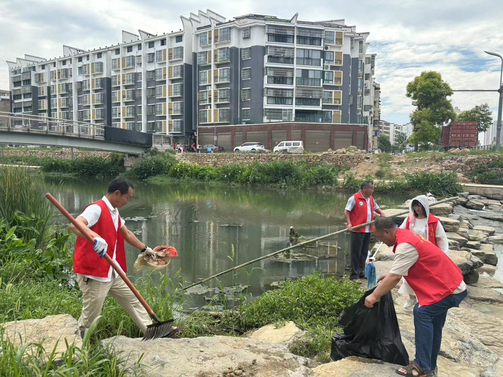 烈日當(dāng)頭,社區(qū)志愿者們手拿垃圾夾和垃圾袋,對河道內(nèi)漂浮垃圾、河道兩側(cè)衛(wèi)生死角、枯枝落葉進(jìn)行清理。經(jīng)過兩個多小時的一路巡、一路撿,河道面貌煥然一新。遇到過路居民,志愿者們熱情地向居民進(jìn)行環(huán)保知識宣傳,號召大家共同保護(hù)河道環(huán)境,杜絕向河道周邊傾倒垃圾等不文明行為。