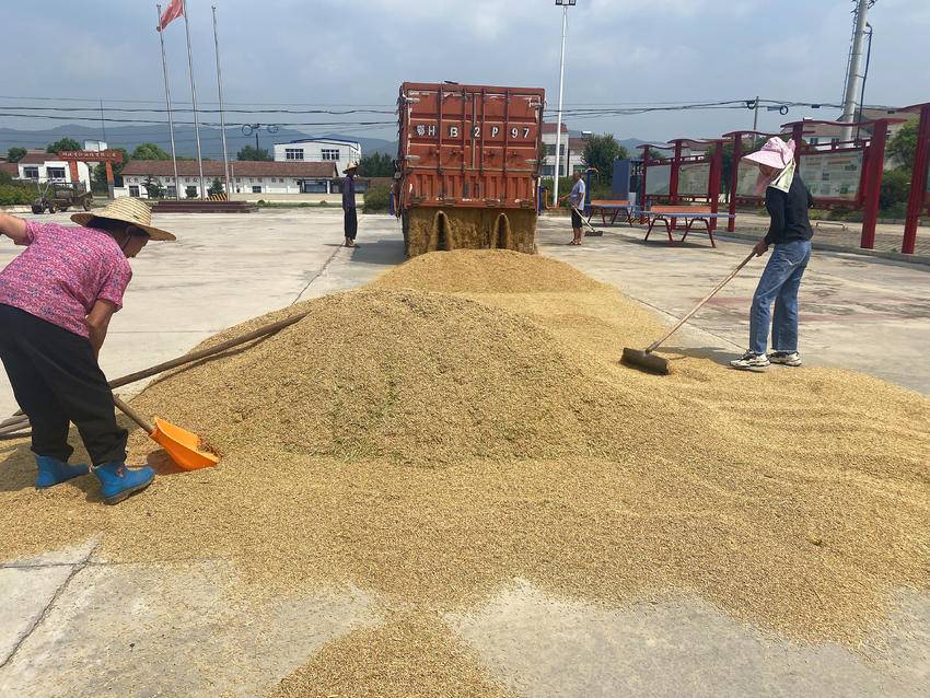 為預(yù)防不利天氣對秋收造成影響,丁家塝村村干部齊上陣,拿起掃帚、鐵鍬和鐵杈幫助村民搶收稻谷。為方便村民晾曬稻谷,村委會門口活動中心廣場變稻場,每天金黃的稻谷都能鋪滿村部廣場,呈現(xiàn)出一派豐收的景象。