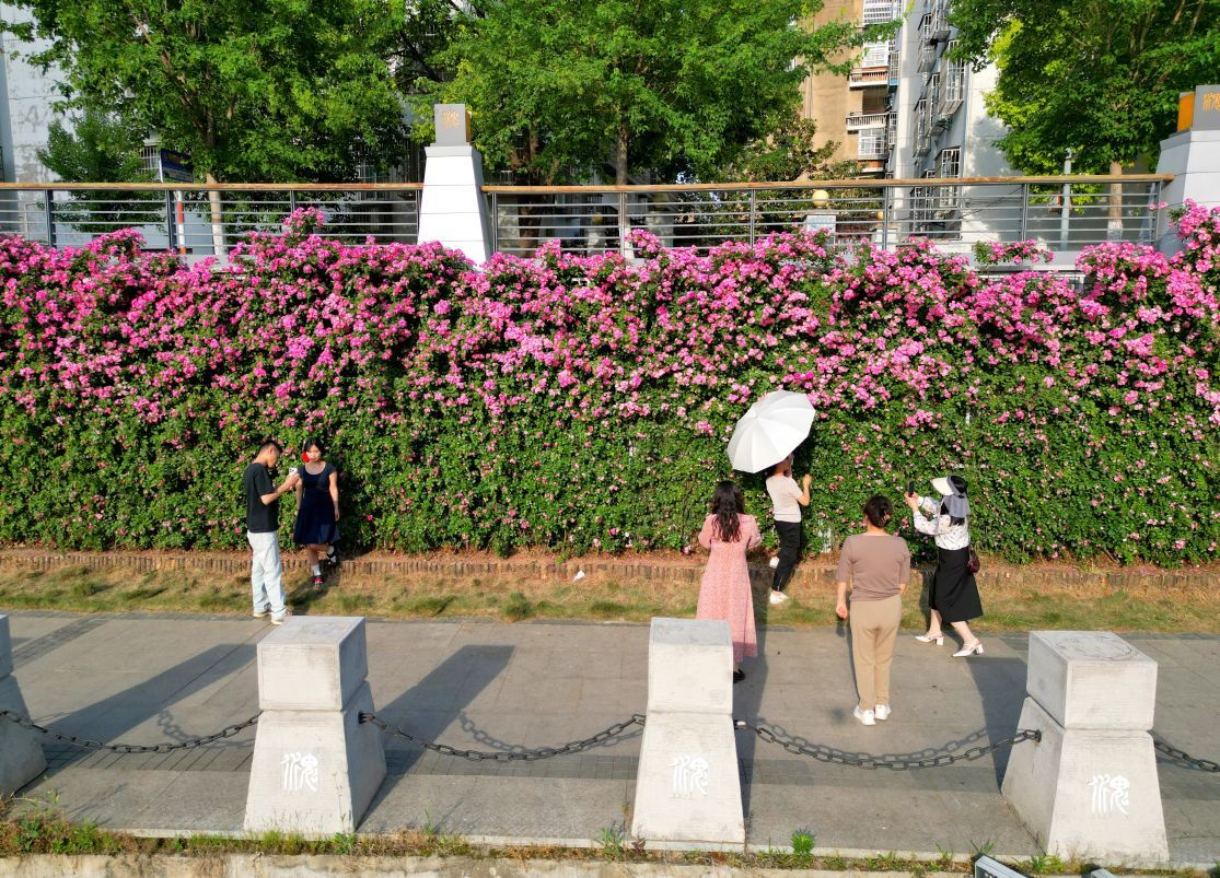 近日,位于京山河河畔的薔薇花悄然盛放,一朵朵薔薇垂下枝頭,形成了花瀑。不少市民特意前來(lái)賞花拍照、開(kāi)展短視頻創(chuàng)作。(肖朕天、徐葵)