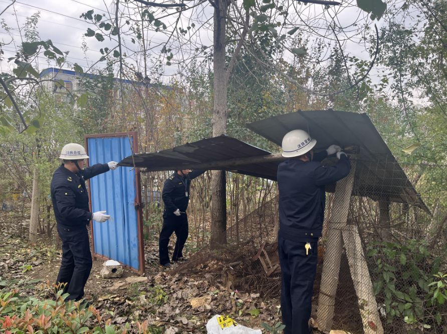11月20日下午,新市街道綜合執(zhí)法中心收到來自城管通App群眾反饋,位于丹桂花卉城西側(cè)路邊的樹林內(nèi)存在私搭亂建的鐵皮棚現(xiàn)象,影響了周邊環(huán)境的整潔美觀。接到派單后,執(zhí)法中心迅速響應(yīng),聯(lián)合城畈社區(qū)開展一次