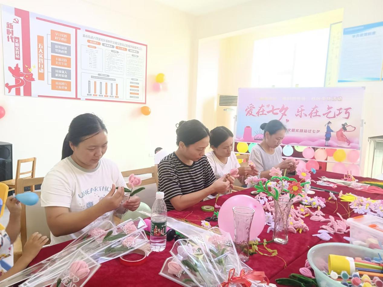 8月7日,新市街道八里途社區(qū)新時代文明實踐站活動中心開展“愛在七夕,樂在乞巧”主題活動。在志愿者的指導(dǎo)下,婦女小組成員們開始嘗試用扭扭棒編織組裝出花朵?;顒又校齻儾粌H展示了各自的手工技藝——組裝花朵