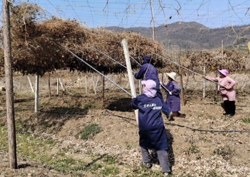 2月25日,新市街道荷花堰村瓜蔞基地里呈現(xiàn)一片忙碌景象,工作人員正專心致志地開展網(wǎng)藤清理工作。