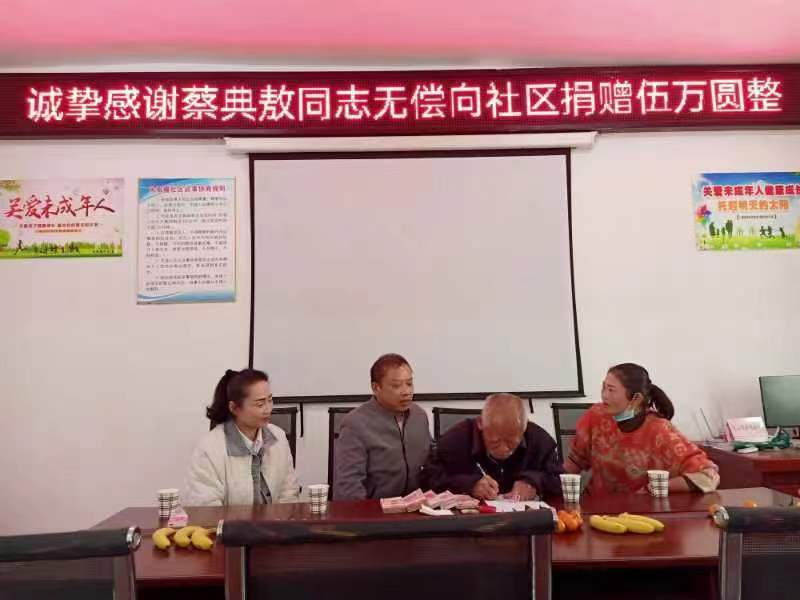 11月26日,家住京山市新市街道鳳凰堰居民點(diǎn)的愛(ài)心老干部蔡典敖及其家屬一行到鳳凰堰社區(qū)進(jìn)行無(wú)償愛(ài)心捐贈(zèng)5萬(wàn)元。 (老干部無(wú)償愛(ài)心捐贈(zèng))“年過(guò)九十的蔡爺爺是我們社區(qū)的一位退休老干部,雖然每月有固定的退休
