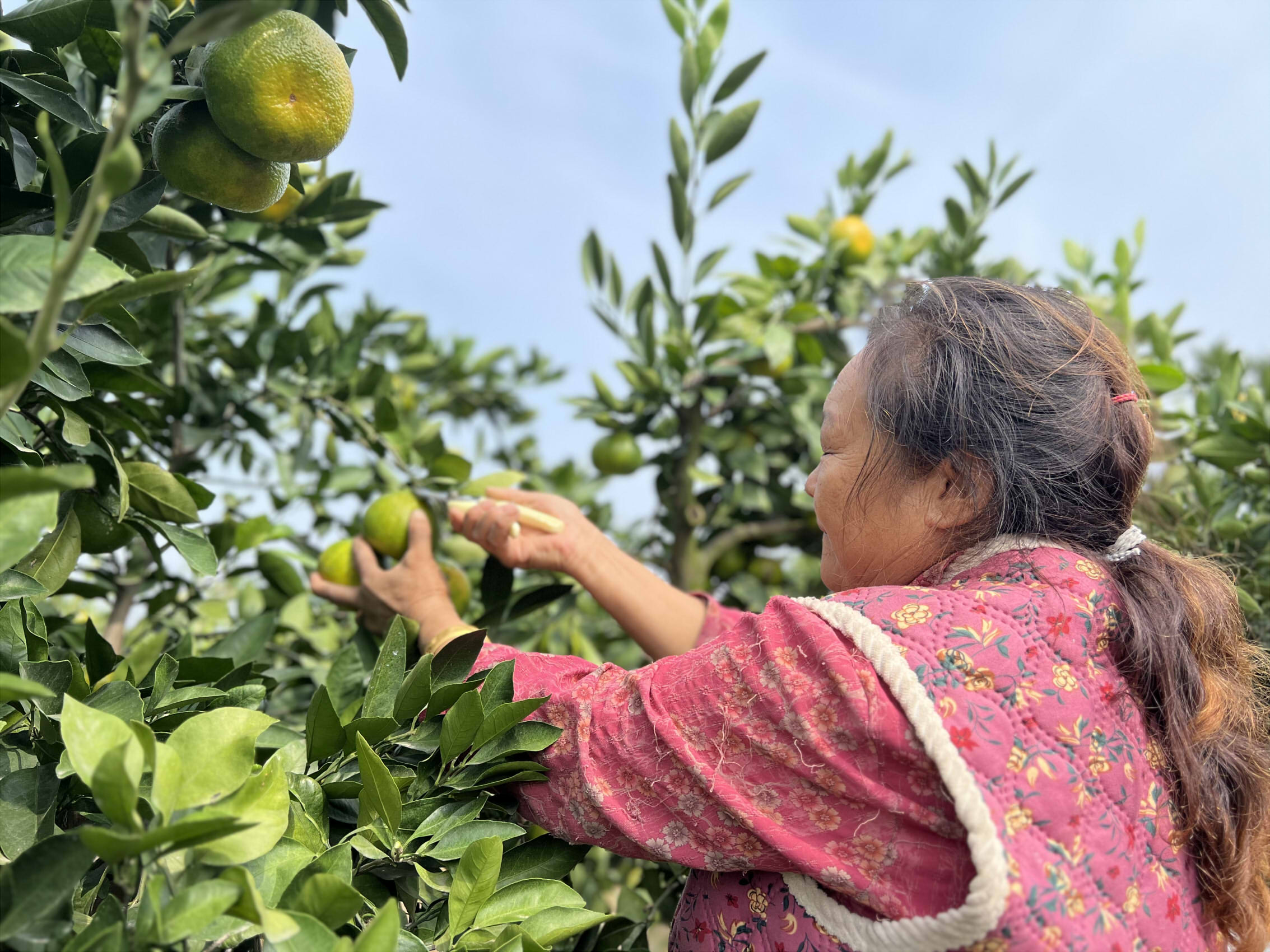 10月15日,在永興街道汪林崗村六組柑橘種植園內(nèi),數(shù)名農(nóng)戶正互相幫忙,將采摘的“金果果”分揀裝箱,為來(lái)自河南南陽(yáng)的客戶“備貨”。 圓潤(rùn)飽滿的柑橘在枝頭上掛,枝葉搖擺,果香滿溢,氤氳撲鼻,似是在歌