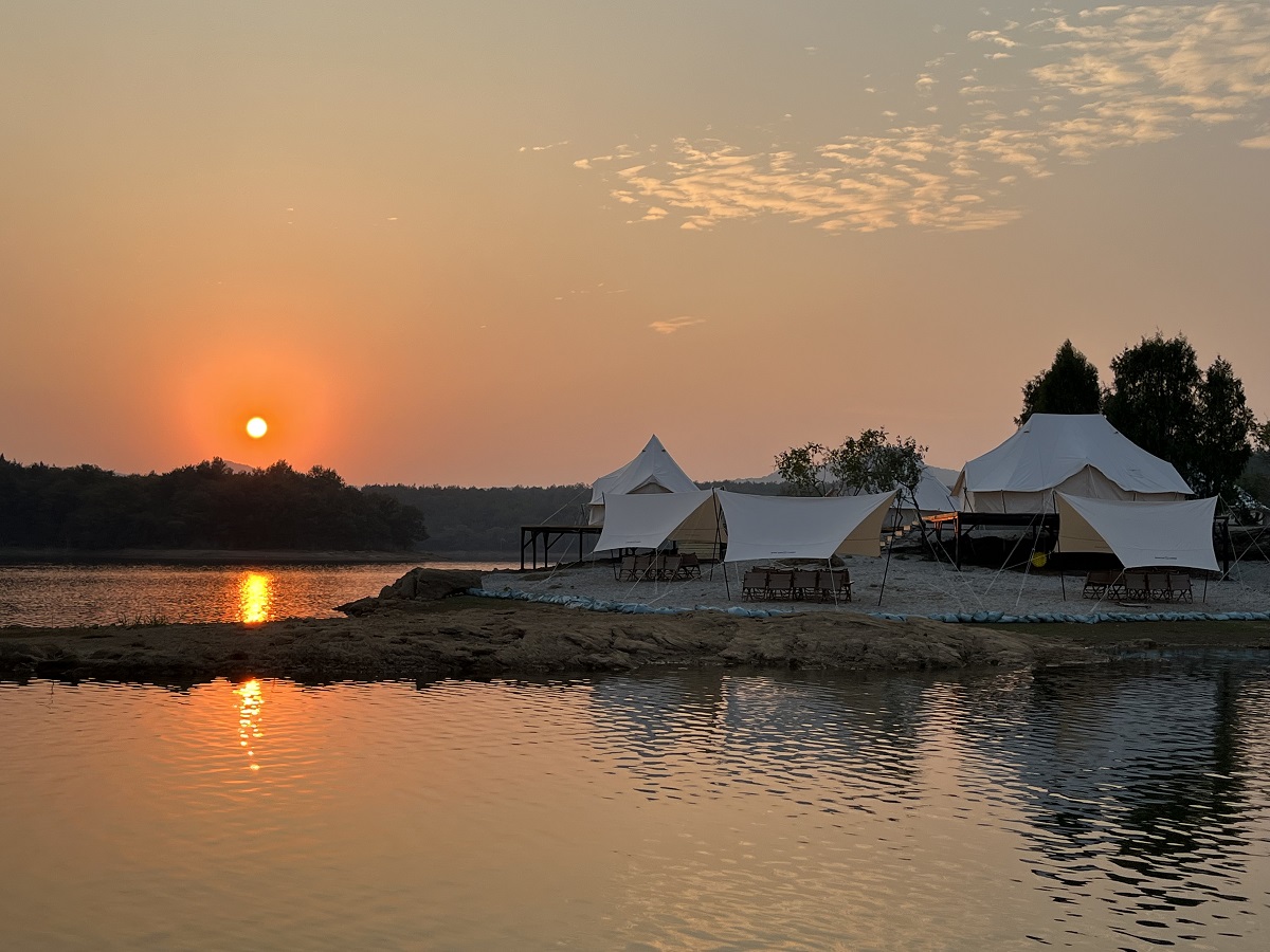 晴秋無(wú)垠,山野多姿。10月9日,走進(jìn)永興街道棲棲·汀嶼路亞營(yíng)地,在汀河水庫(kù)北麓尋一方路亞釣魚(yú)好去處,于綠坪草地上撐一頂精致野性的天幕帳篷,遠(yuǎn)望山林水畔漣漪陣陣,花草石道如彩帶般蜿蜒于峻嶺。別樣季節(jié),秀