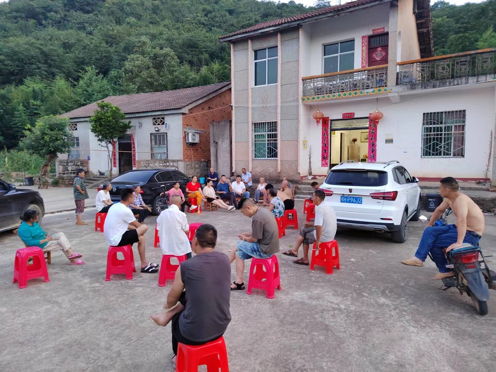 7月11日早上,永興街道楊河村村委會門前聚集了20余位村民,大家搬出“紅板凳”圍圈而坐,在“灣組板凳議事會”上打開了“話匣子”。(永興街道楊河村“灣組板凳議事會”)“通村道路上有些碎石、土堆,大家騎車