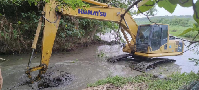 8月16日,在永興街道蘇佘畈村的京山河北干渠里挖掘機正在緊張的施工作業(yè)中。連日來,高溫天氣持續(xù),永興街道蘇佘畈村組織人員使用挖掘機對京山河北干渠進行清淤掃障,對流經(jīng)村里的京山河河底的淤泥、河岸周邊的垃