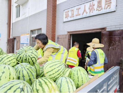 下午5點(diǎn),一車車滿載愛(ài)心的西瓜陸續(xù)送至昌利源保潔站、人民大道保潔站、云杜保潔站。環(huán)衛(wèi)工人的臉上洋溢著笑容?!斑@西瓜送的真及時(shí),感謝這些愛(ài)心企業(yè),”環(huán)衛(wèi)工人鄭師傅高興地說(shuō)道?,F(xiàn)場(chǎng),不少工人圍坐在一起,邊吃西瓜邊拉家常,陣陣歡聲笑語(yǔ)驅(qū)散了夏日的炎熱。