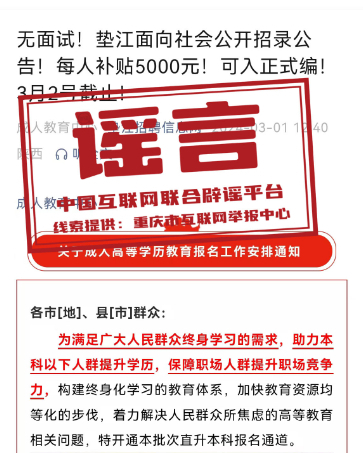 ??真相:近日,“墊江招聘信息網(wǎng)”微信公眾號(hào)發(fā)布信息:“無面試!重慶墊江面向社會(huì)公開招錄公告!每人補(bǔ)貼5000元!可入正式編!”部分網(wǎng)民看到該信息后誤認(rèn)為,墊江面向社會(huì)以補(bǔ)貼形式招錄具有正式編制的公務(wù)人員,于是紛紛向墊江縣有關(guān)部門致電咨詢招錄情況。經(jīng)核實(shí),近年來,墊江未曾以補(bǔ)貼方式和不經(jīng)過面試招錄具有正式編制公務(wù)人員。該信息實(shí)則為成人學(xué)歷提升培訓(xùn)信息,而非正式編制公務(wù)人員招錄信息。墊江縣互聯(lián)網(wǎng)信息辦公室已依法對(duì)發(fā)布該信息的微信公眾號(hào)負(fù)責(zé)人進(jìn)行約談和教育批評(píng),指出虛假信息的危害性,并責(zé)令刪除相關(guān)信息。(來源:重慶辟謠)