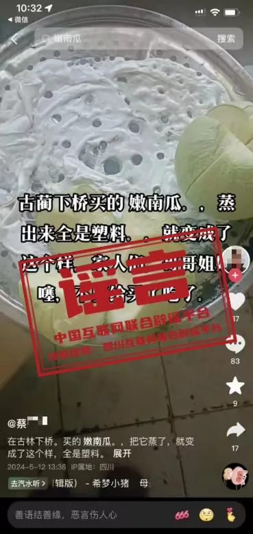真相:近日,一篇內(nèi)容為“四川古藺下橋買(mǎi)的嫩南瓜。蒸出來(lái)全是塑料......”的視頻在網(wǎng)上傳播。經(jīng)四川省古藺縣公安局網(wǎng)安大隊(duì)核查,此內(nèi)容為謠言。發(fā)帖人蔡某為了吸引眼球,在家中通過(guò)某短視頻平臺(tái)發(fā)布南瓜里面流出塑料物體的虛假視頻,視頻獲得點(diǎn)贊共計(jì)4000余個(gè),轉(zhuǎn)發(fā)達(dá)7800余次,造成不良社會(huì)影響。目前,蔡某因虛構(gòu)事實(shí)、散布謠言被依法予以行政處罰。(來(lái)源:四川互聯(lián)網(wǎng)舉報(bào)辟謠平臺(tái)、古藺發(fā)布)