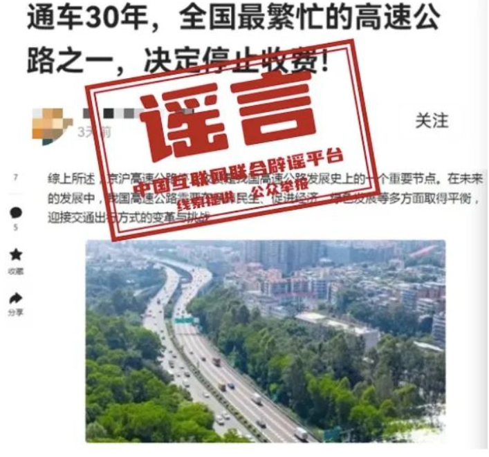 | 今日辟謠 謠 言 京滬高速公路停止收費?真相:近日,有網(wǎng)民在網(wǎng)絡平臺發(fā)文“通車30年,全國最繁忙的高速公路之一,決定停止收費!”,宣稱“京滬高速公路停止收費”。經(jīng)中國互聯(lián)網(wǎng)聯(lián)合辟謠平臺向有關主管部門 |