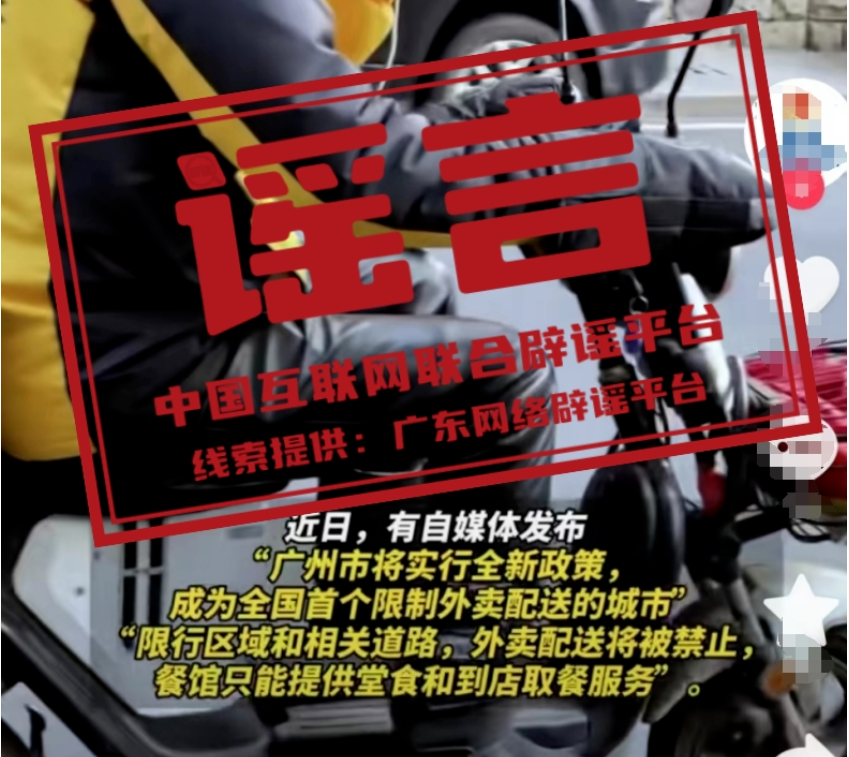 | 2023年12月25日 謠 言 廣州市將限制外賣配送?真相:近日,有自媒體發(fā)布“廣州市將實(shí)行全新政策,成為全國首個限制外賣配送的城市”“限行區(qū)域和相關(guān)道路,外賣配送將被禁止,餐館只能提供堂食和到店取 |