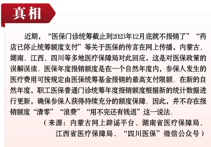 | 2023年12月18日??謠言:醫(yī)保統(tǒng)籌額度年底將清零???真相:近日,“醫(yī)保門診統(tǒng)籌截止到12月15日就不報(bào)銷了”“明年沒有門診統(tǒng)籌這個政策了!”等幾則關(guān)于醫(yī)保的謠言在網(wǎng)上傳播。對此,內(nèi)蒙古錫林郭勒 |