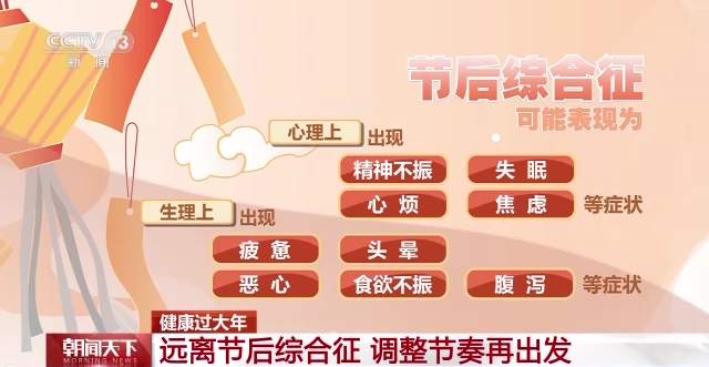 節(jié)后綜合征可能表現(xiàn)為心理上出現(xiàn)精神不振、失眠、心煩、焦慮等癥狀。在生理上出現(xiàn)疲憊、頭暈、惡心、食欲不振,腹瀉等癥狀。