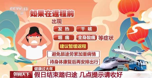 如果在返程前,出現(xiàn)發(fā)熱、干咳、咽痛、全身酸痛等癥狀,建議暫緩返程,避免旅途勞累加重病情,待身體康復(fù)后再安排出行。