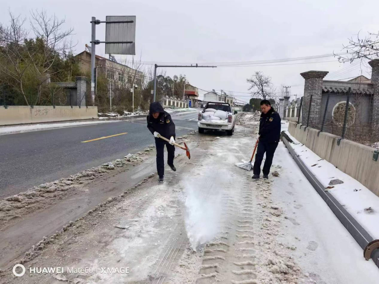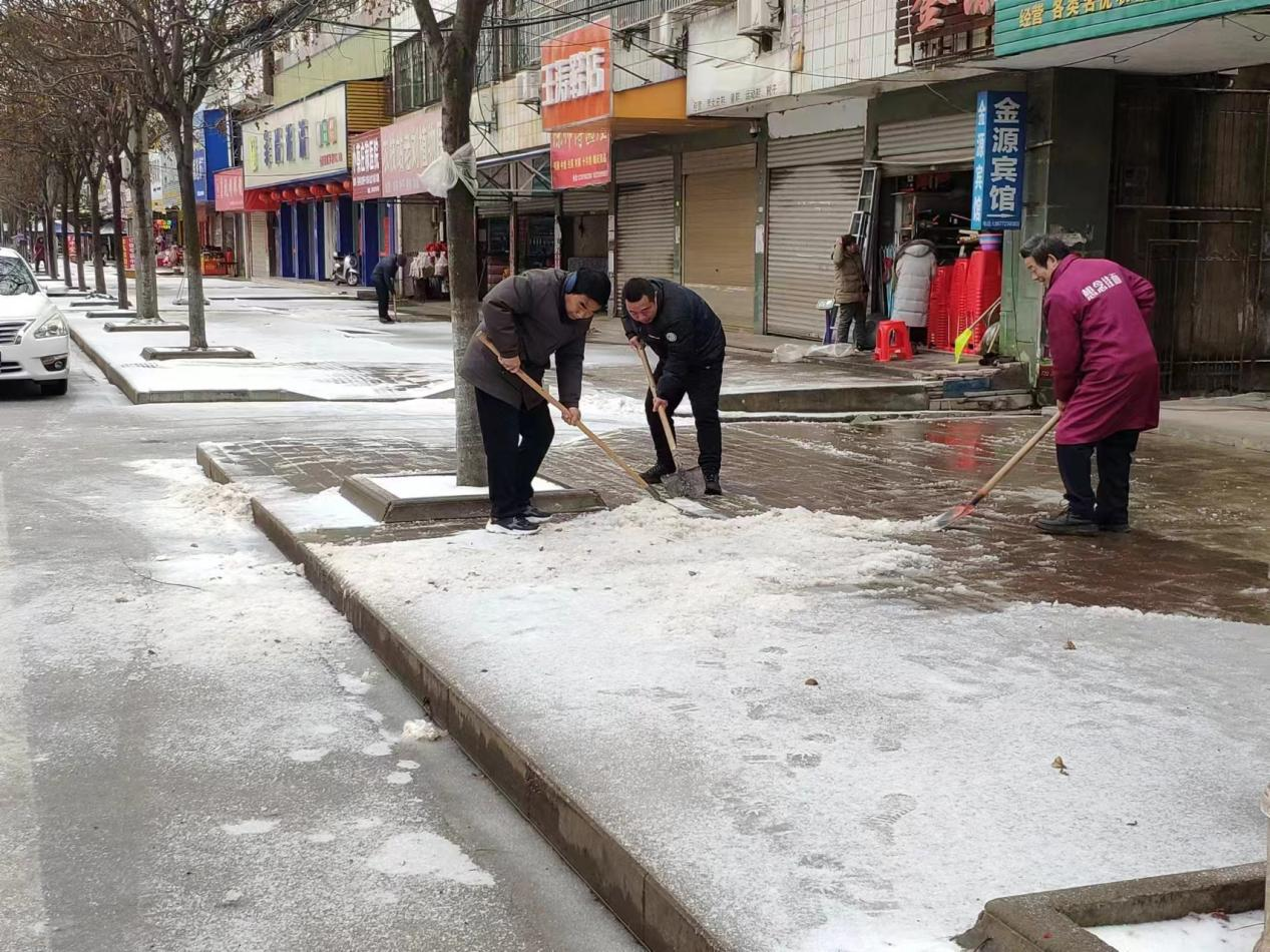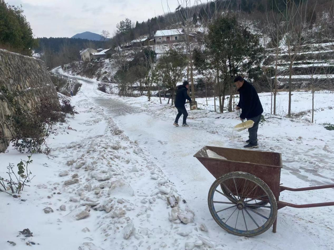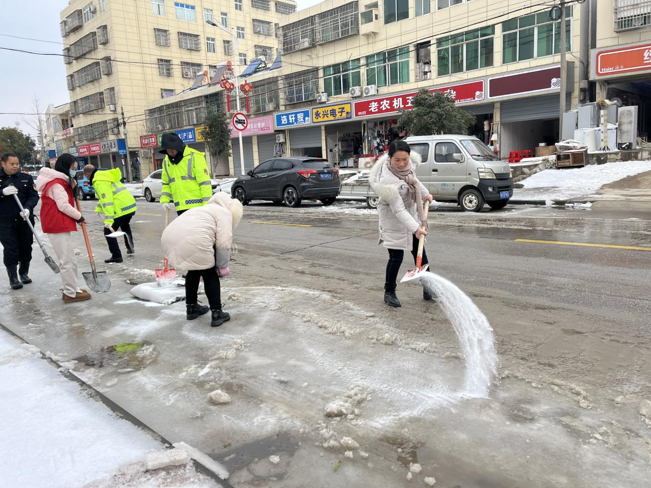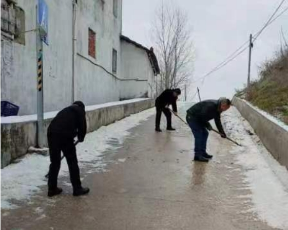 曹武鎮(zhèn)黨員干部撒鹽融雪,清理主次干道、通戶(hù)道路、上、下坡路段,方便群眾出行。