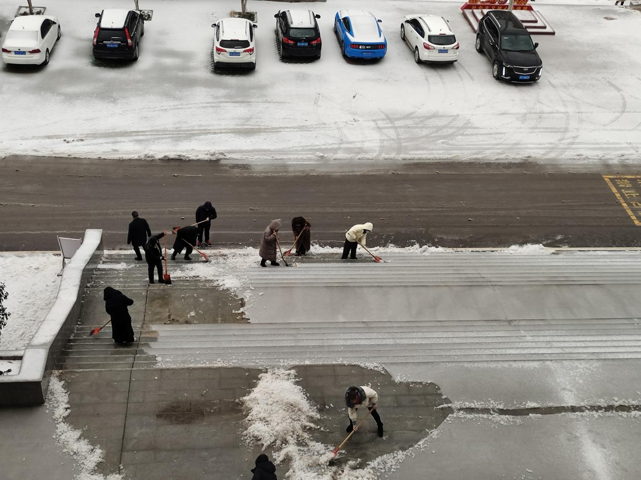 | 2月21日一大早,綠林鎮(zhèn)山川田野經(jīng)過一夜風(fēng)雪,被50余毫米的冰雪覆蓋,道路結(jié)了厚厚的一層冰,車輛受阻。 8點剛過,綠林鎮(zhèn)政府的20多名干部帶著鐵鍬、笤帚,在門前道路率先開始了鏟雪行動,大家鏟的鏟、掃 |