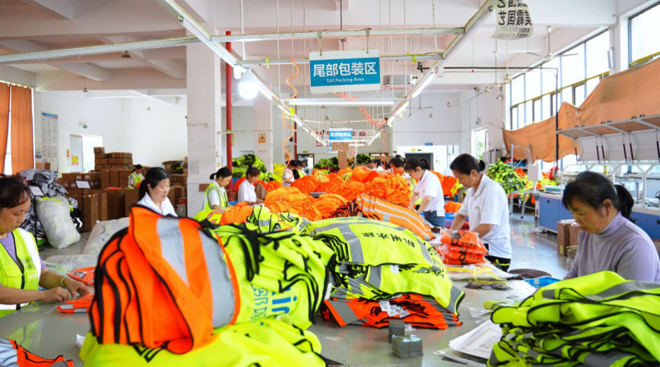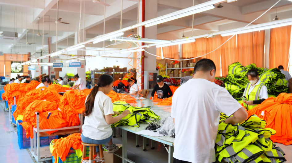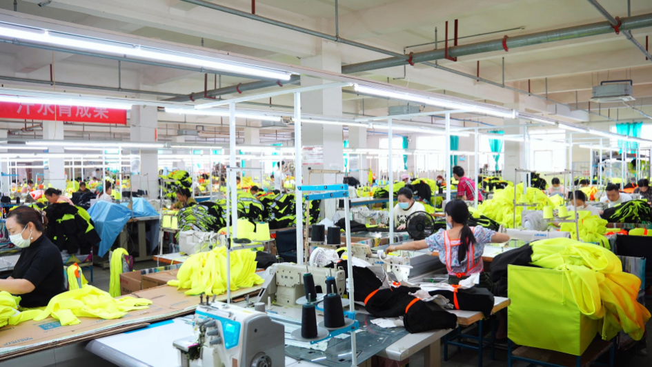 在公司后港鎮(zhèn)的生產車間里,120多名工人忙個不停,伴隨著縫紉機的嗒嗒聲,一件件反光背心被生產出來。