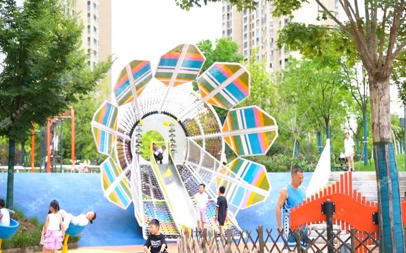 小朋友們在滑梯、沙坑邊嬉笑玩耍