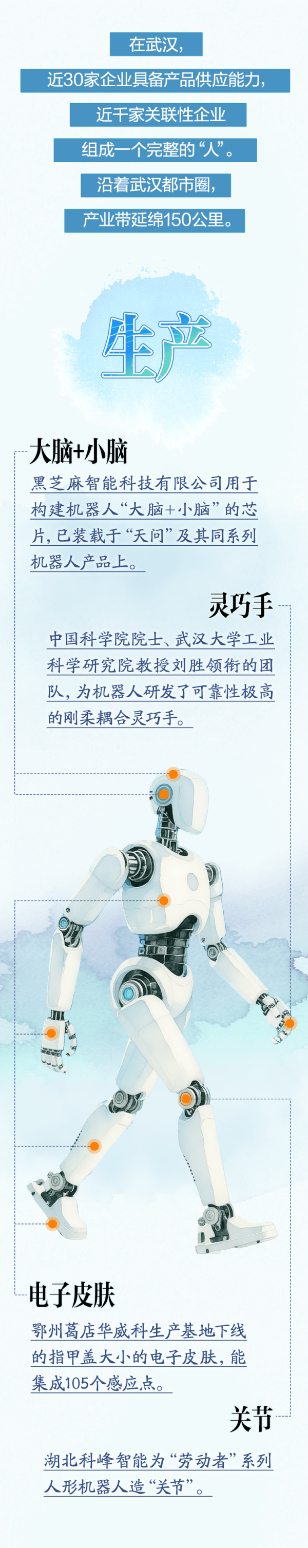 在鄂州,華威科研發(fā)的“電子皮膚”已實(shí)現(xiàn)1克級(jí)感知精度;在黃岡,湖北科峰智能為“勞動(dòng)者”系列人形機(jī)器人造“關(guān)節(jié)”;在孝感,飛恩微電子等帶動(dòng)傳感器、精密傳動(dòng)企業(yè)集聚。