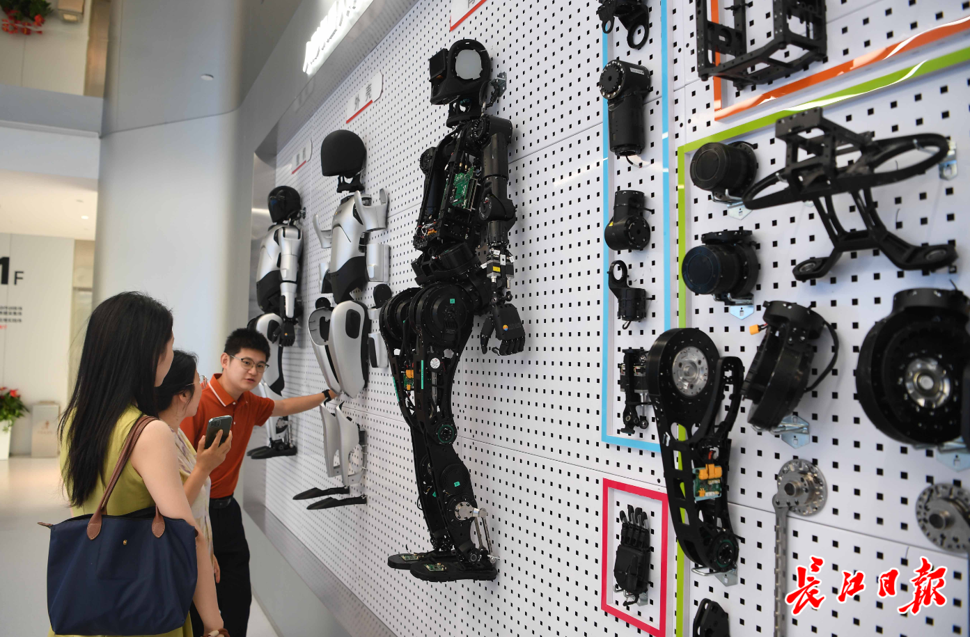 湖北人形機(jī)器人創(chuàng)新中心展示的人形機(jī)器人骨架、外殼、零部件。 記者高勇 攝