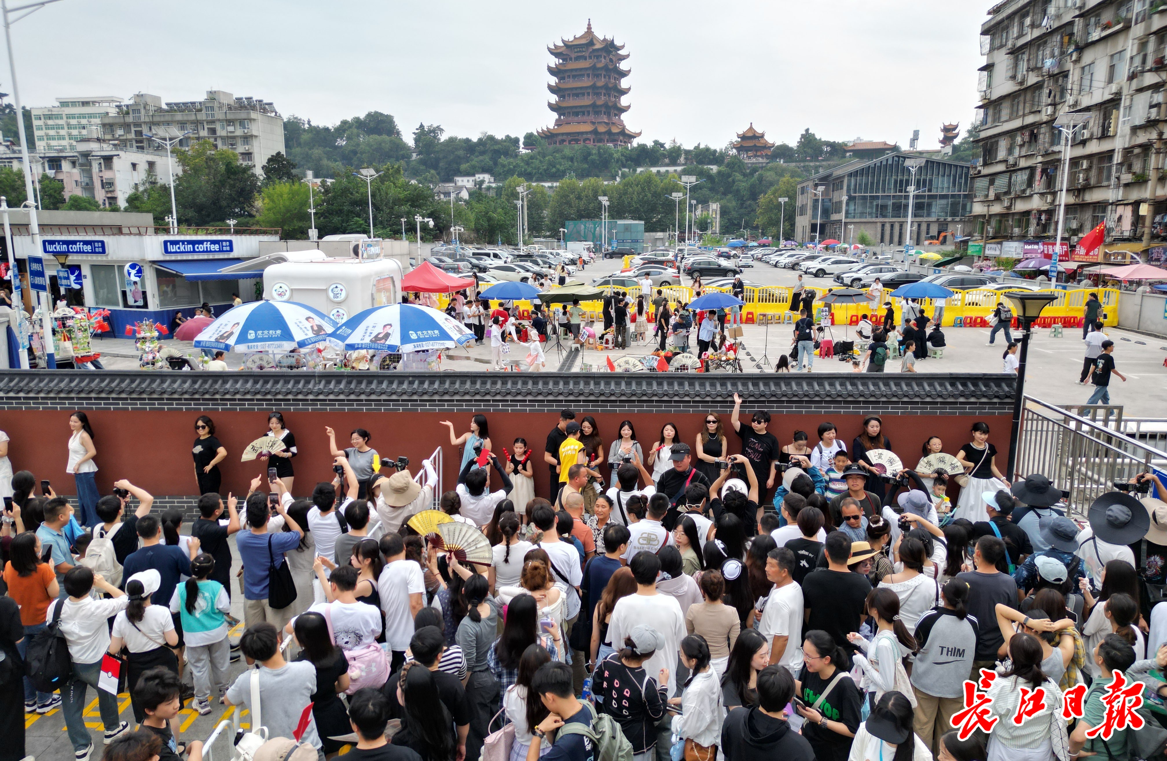 地鐵5號(hào)線司門(mén)口黃鶴樓站外圍滿(mǎn)了前來(lái)打卡拍照的游客。 記者詹松 攝