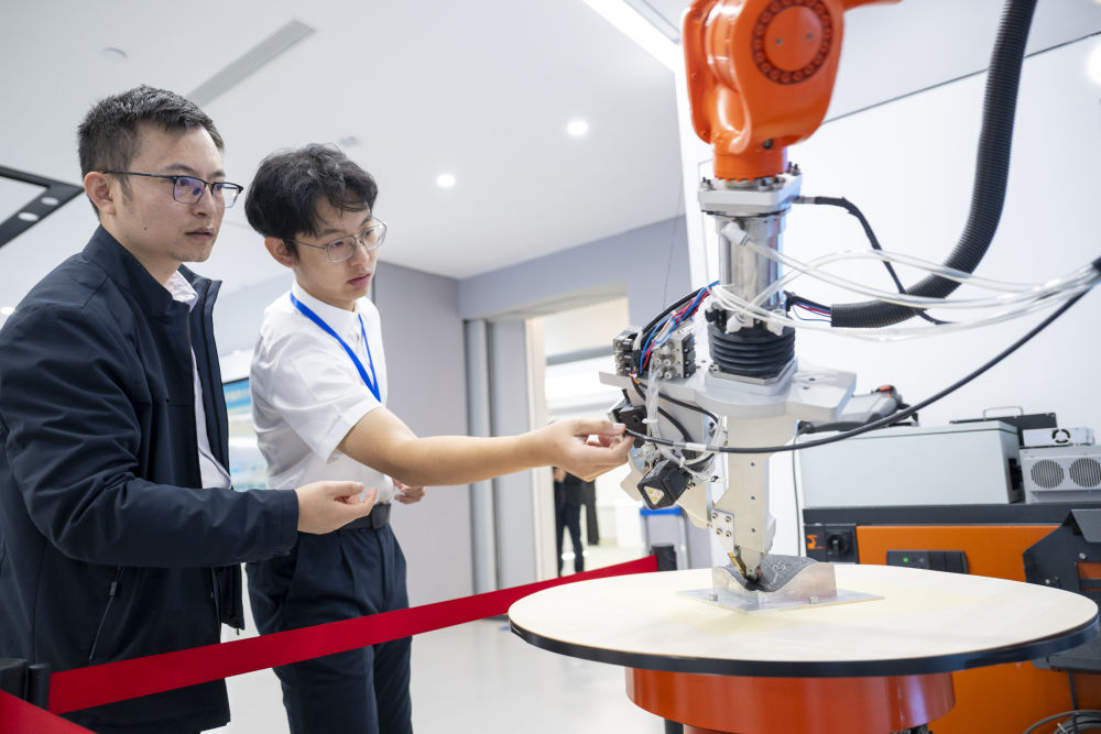 11月6日,在武漢產(chǎn)業(yè)創(chuàng)新發(fā)展研究院,工作人員展示增材制造機(jī)器人。新華社記者 伍志尊 攝