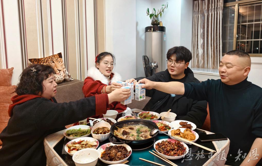袁娜從早上就開始忙活。萵筍炒香腸、酸辣土豆片、燉了一上午的臘蹄子,一盤一盤端上桌……潘媛希、譚哲和廖利秀在一旁打下手。