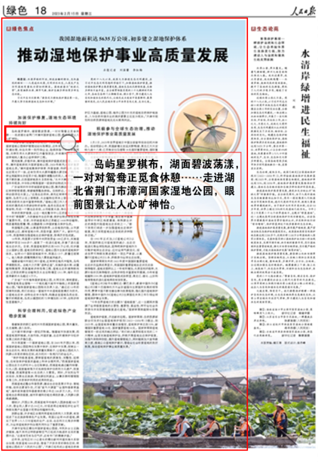 | 今天(2月15日),《人民日?qǐng)?bào)》第18版刊登《我國(guó)濕地面積達(dá)5635萬(wàn)公頃,初步建立濕地保護(hù)體系推動(dòng)濕地保護(hù)事業(yè)高質(zhì)量發(fā)展》一文,其中對(duì)湖北荊門(mén)市加強(qiáng)保護(hù)修復(fù),濕地生態(tài)環(huán)境持續(xù)向好進(jìn)行了報(bào)道。全文如下 |